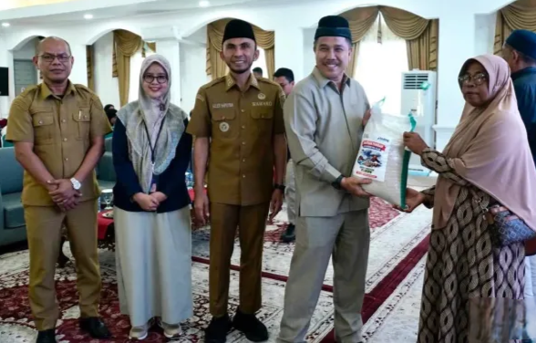 Kepala keluarga yang mendapat bantuan diserahkan secara simbolis oleh Wakil Walikota Padang Panjang Allex Saputra, didampingi oleh Ketua Komisi III DPRD Mahdelmi, perwakilan Perum Bulog Cabang Bukittinggi Fhitry Rahmi, serta pejabat lainnya, Selasa (31/3/2026).
