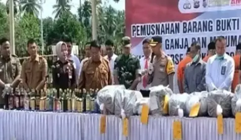 Sebanyak barang bukti yang dimusnahkan terdiri atas ganja kering seberat 26,842 kilogram dan 409 botol minuman keras dari berbagai merek.