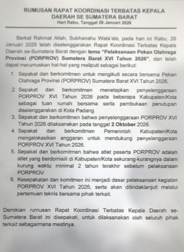 Namun setelah dilakukan Rapat Koordinasi Terbatas Kepala Daerah se-Sumatera Barat dan disepakati bersama bahwa pelaksanaan Porprov diundur menjadi bulan Oktober 2026.