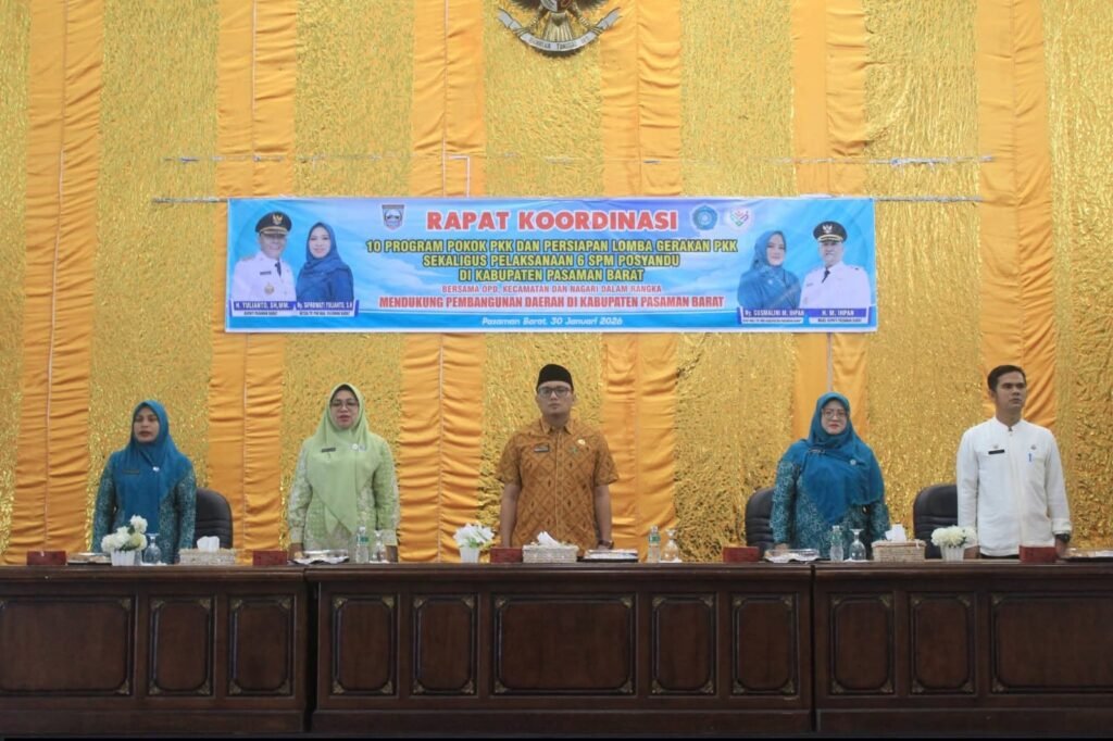 Kegiatan tersebut dirangkai dengan Rakor pelaksanaan enam Standar Pelayanan Minimal (SPM) Posyandu, bertempat di Aula Kantor Bupati Pasaman Barat, Jumat (30/1/2026).
